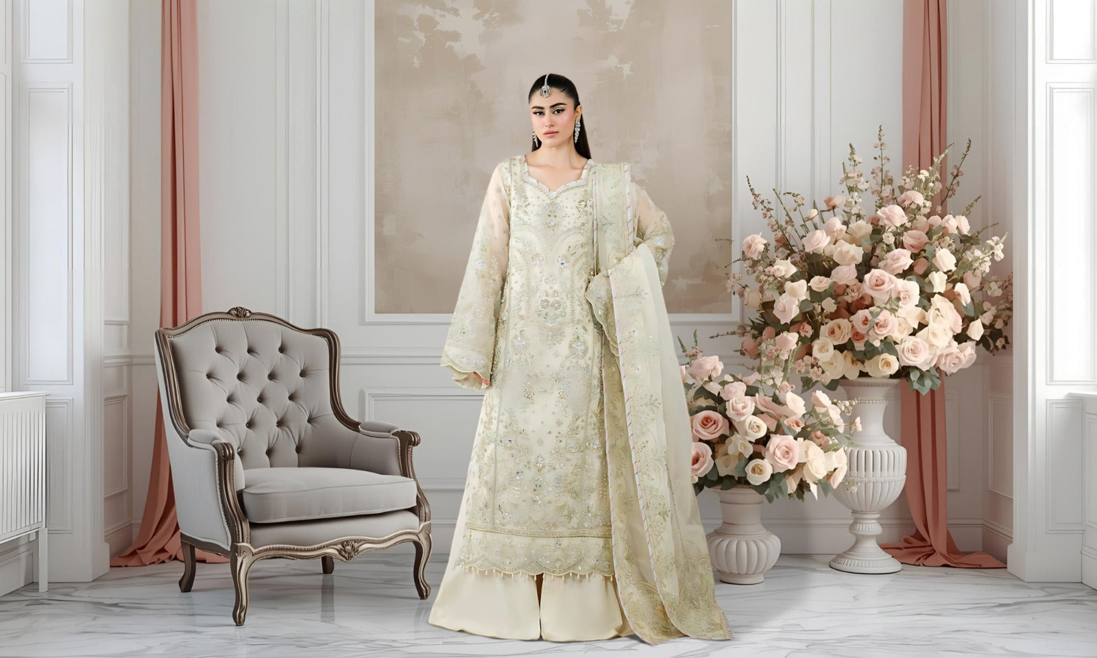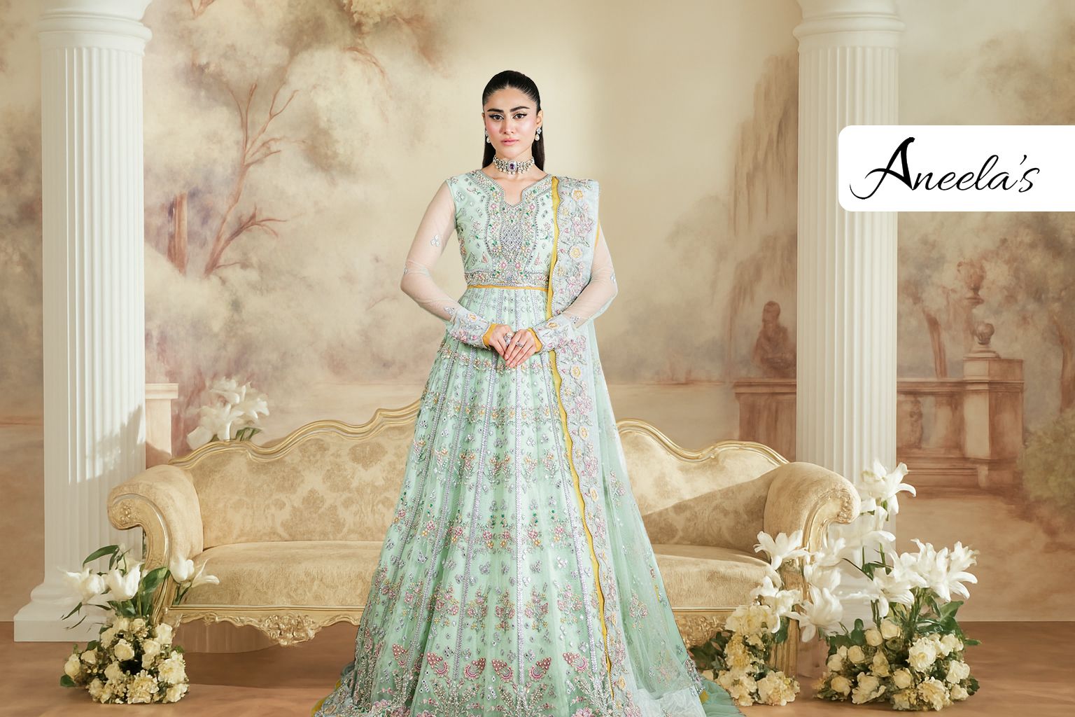 Rs 22500 Aneelas Stitched Silk Shirt Trouser Net Emb Duppata Formal 3pc [FC-09] [Dispatch Time 2 Months]